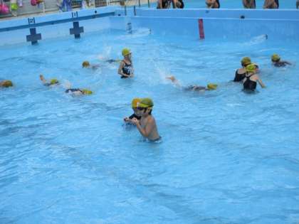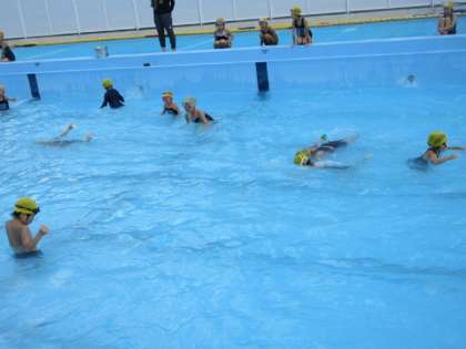 2組と4組は最後の水泳です。みんなで楽しく水中宝さがしをしています。