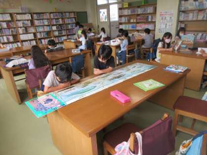 なが〜い本を友達と読んでいる子どもがいました。水の中の生き物と土の中の生き物の本です。