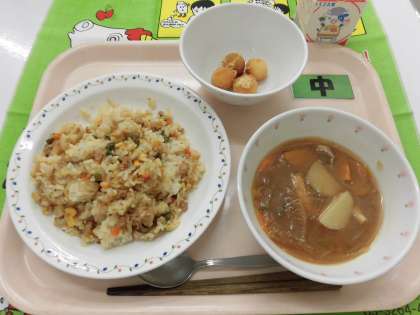 【献立】そぼろごはん・みそ汁・月見だんご・牛乳