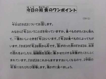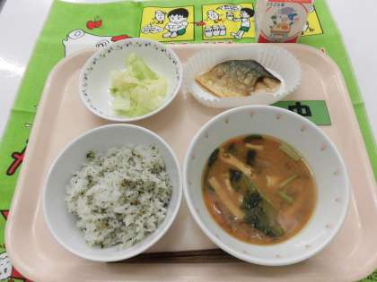 【献立】青のりごはん・鯖の塩焼き・キャベツの甘酢かけ・みそ汁・牛乳