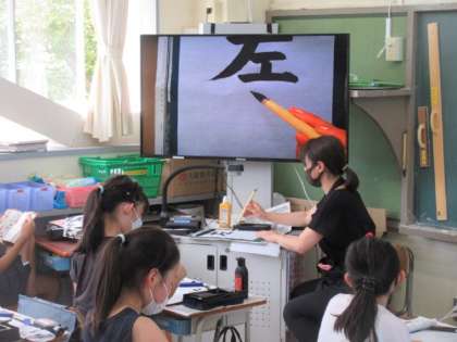 書写担当の先生が文字を大型テレビに映し出しています。子どもたちはそれをよく見ながら集中して書いていました。