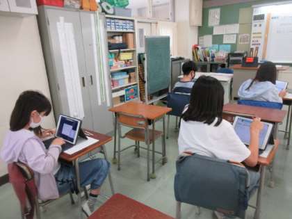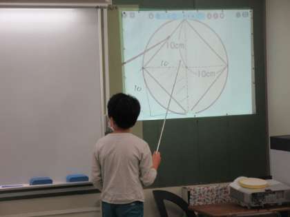 円に外接する正方形と内接する正方形の面積をもとに円の面積のおよそを求める学習。今後の学習で公式(半径×半径×円周率)を導き出していきます。