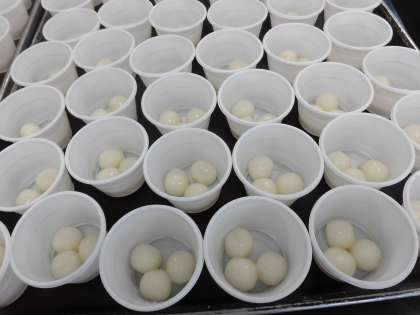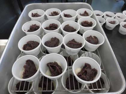 白玉団子にあんこをかけて、おはぎ風に仕上げました。給食室であんこを作ることはなかなかないので、前日から打ち合わせを十分に行いました。柔らかく煮た小豆をミキサーにかけてあんこにしました。白玉団子の入ったカップにあんこをきれいに入れるのも大変でした。