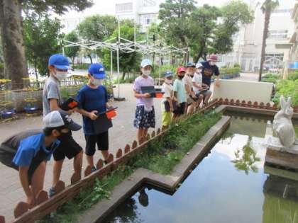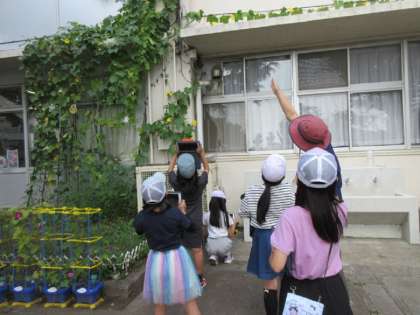 自分のタブットを持って、外で生き物も探しをしていました。友達や先生と声をかけ合いながら写真に撮っていました。