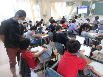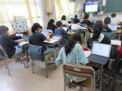環境が学習のテーマ。タブレットを使って環境について調べながら、視野を広げ、課題を見つけていきます。