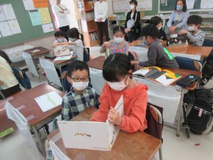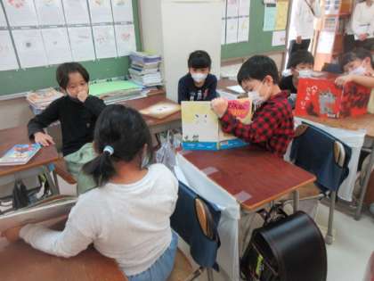 2人組になって、おすすめの本を友達に読み聞かせていました。