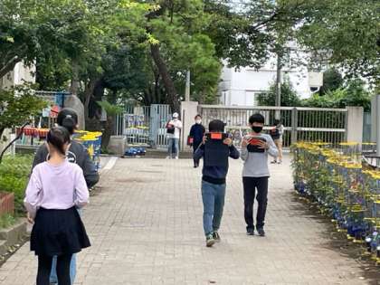 平均の学習。タブレットの計測アプリと自分の歩幅を使って、校庭の長さを測定しています。