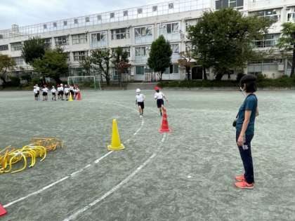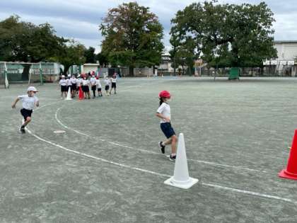 リレーの学習です。カーブのラインに沿って走るのがポイントです。