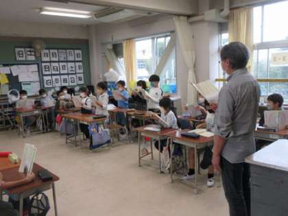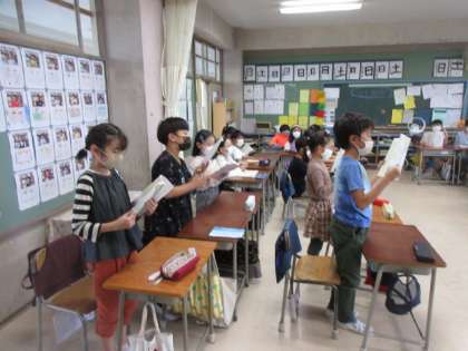 漢詩を音読しています。声をそろえ、リズムよく読むことが大切です。