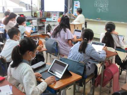 比例の学習で先生に教わりながらエクセルを使ったグラフ作りに挑戦しています。