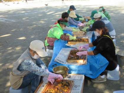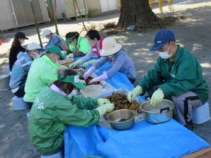 今日も朝会、地域や保護者の皆様がぎんなんの仕分けや洗いなどたいへんな作業をしてくださっています。本当にありがとうございます。