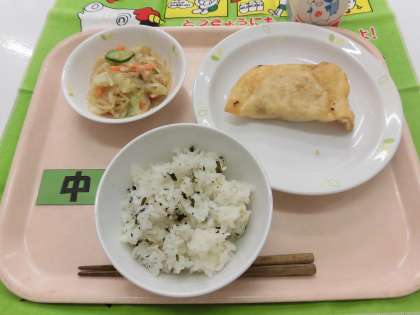 【献立】わかめごはん・ジャンボ餃子・春雨サラダ・牛乳