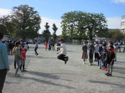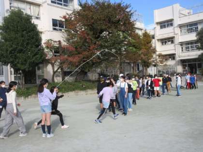 なわとびの季節がやってきました。今日は4,5,6年生の長なわとびです。3分間で何回とベるか。みんなで声を掛け合いながらとんでいました。