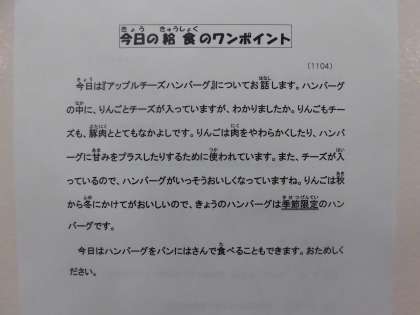 【献立】ミルクパン・アップルチーズハンバーグ・粉吹き芋・野菜スープ・牛乳