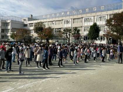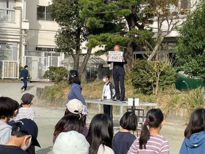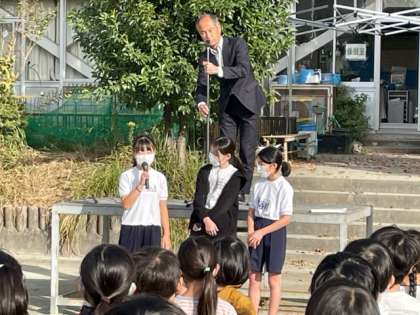今日は偶数学年の児童が校庭に出ました。6年生のあいさつの号令に続いて、校長先生からは、卒業アルバムを通して、よい思い出を作るためにどうしたらよいかを考えようというお話がありました。