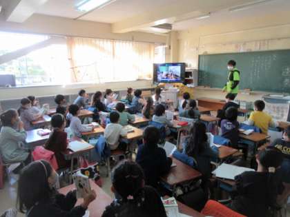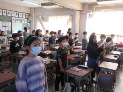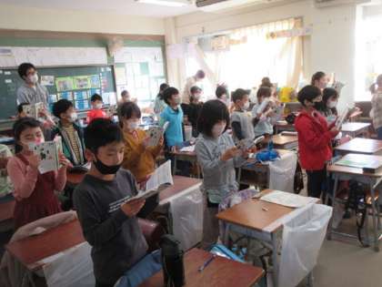 秋にぴったりの曲「もむじ」。動画で1年生の合唱を聞いたあと、みんなで歌いました。きれいな歌声でした。
