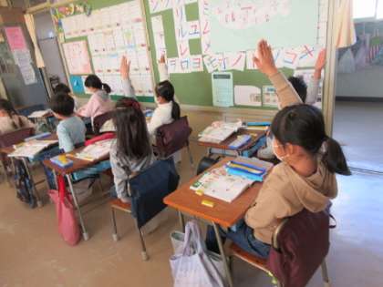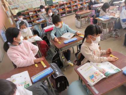 5−2のひき算の学習。1年生の算数はブロックを操作しながら新しいことを理解していきます。