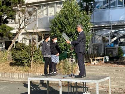 続いて、ソフトテニスの大会でよい成績をおさめた児童の表彰がありました。