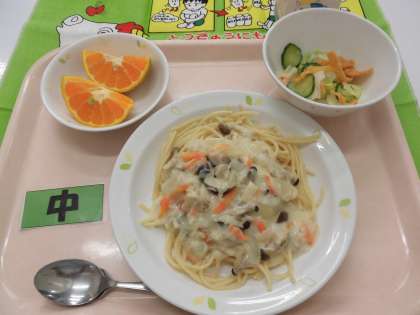 【献立】スパゲティーきのこソース・パリパリサラダ・みかん(早香)・牛乳