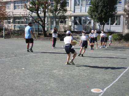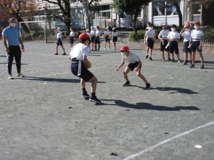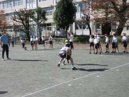 後半は2人組でのミニ・ゲーム。ステップを工夫してトライをあげます。男子も女子も安全に楽しく運動をすることができました。リコーの皆様、ありがとうございます。