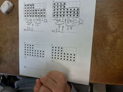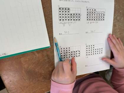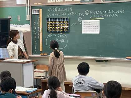 三年次研修の研究授業。単元はかけ算九九づくり。箱に入ったチョコレートの数の求め方を考えます。