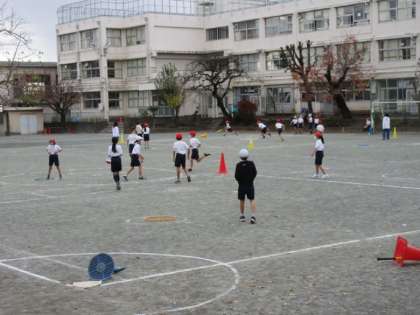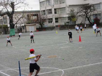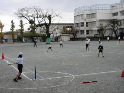 子どもたちが元気にベースボール型ゲームに取り組んでいます。ルールが工夫され、だれでも楽しめます。