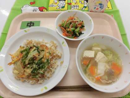 【献立】かき揚げ丼・おひたし・豆腐汁・牛乳