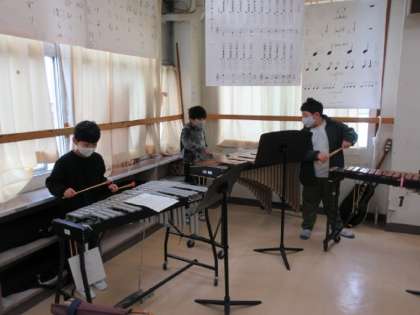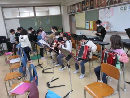 楽器の種別に分かれてグループ伝習しています。合奏する曲は「ジングルベル」。どのグループもいい雰囲気で、よいかかわりをしながら練習をしてます。