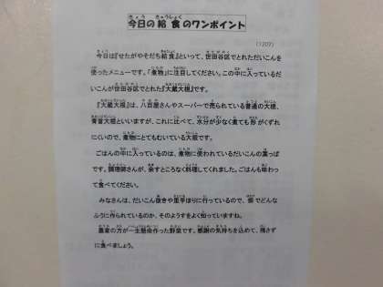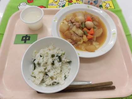 【献立】青菜ごはん・豚肉と大根のうま煮・ホワイトゼリー・牛乳