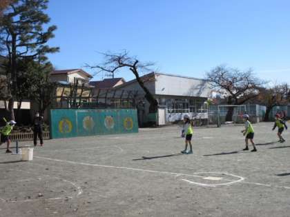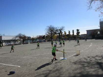チームカラーのビブスをつけて楽しくベースボール型ゲームの練習しています。