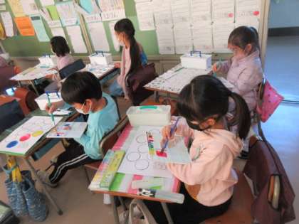 絵の具の基本的な使い方を学習しています。みんな真剣に取り組んでいます。