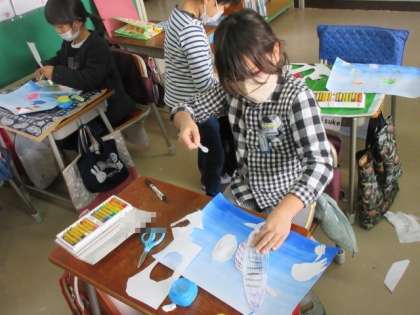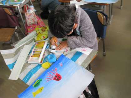 絵の具の青の濃さを変えて海を描き、そこに自分で作った生き物を貼り付け、海の中の世界を描いています。