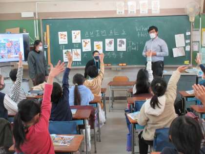 ALTのハンター先生と楽しく動物クイズ。まねをして答えます。もちろん英語で。“What's this?”“This is a giraffe.”