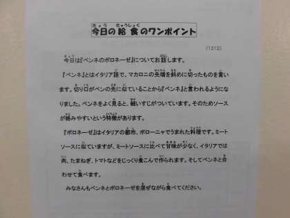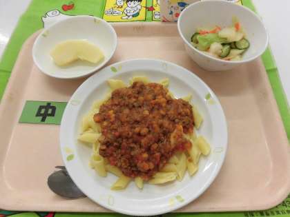 【献立】ペンネのポロネーゼ・ポテト入りフレンチサラダ・りんご・牛乳
