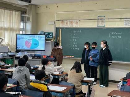 環境問題について考えよう。食糧問題、水、エネルギー、気象など、自分たちで選んだテーマについて、調べたことを発表しました。