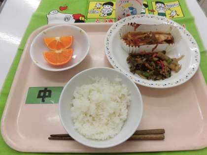 【献立】ごはん・鮭のチャンチャン焼き・くきわかめのきんぴら・牛乳