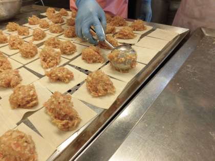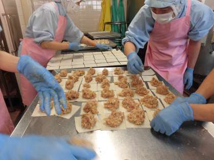 5・6年ぶりに深沢小の給食に『ジャンボシュウマイ』が登場しました。作っている様子をご紹介します。皮は、低学年が9cmの正方形、中学年は10cm、高学年は11cmでした。