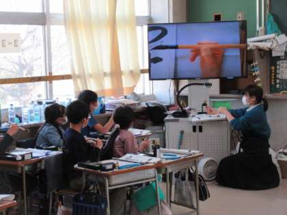 書き初めの練習です。大型テレビに映し出された先生の手本を参考に1画ずつ丁寧に書いています。