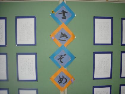先週の金曜日から、各教室の廊下に書き初めが掲示されています。気持ちのこもった作品が並んでいます。じっと見ていると、書いている姿が浮かんでくるようです。(書き初め展は、木曜日までの予定です。)1,2年生は硬筆です。