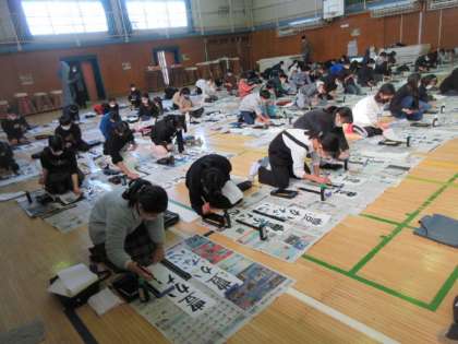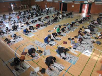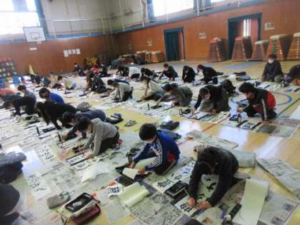 4クラス合同での書き初め会。「豊かな心」をもつ人になるために心を磨きます。