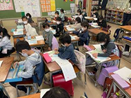 今日は土曜公開です。ここのクラスは大きなかずの学習をしています。10のまとまりを作って、あさがおのたねの数を数えています。