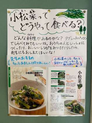 自然の教室の収穫体験。今週から小松菜とりが始まりました。それにちなんだ家庭科室前の掲示です。