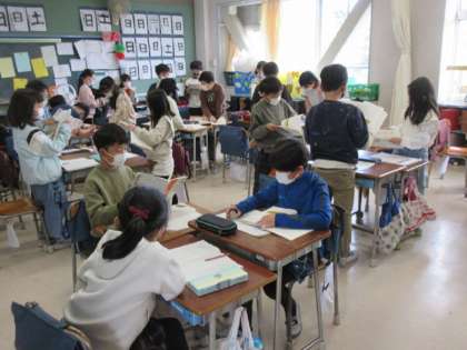 説明文の学習。本文をよく読んで、自分の考えやグループの考えを進んで発表しています。