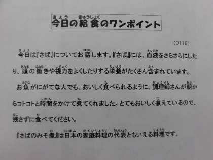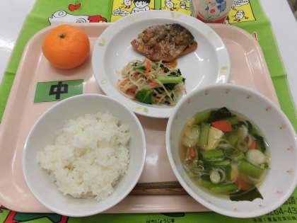 【献立】ごはん・さばのみそ煮・おひたし・すまし汁・みかん・牛乳