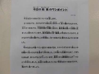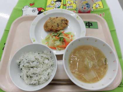 【献立】わかめごはん・手作りさつまあげ・野菜のひとしお・みそ汁・牛乳
