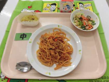 【献立】スパゲティーナポリタン・青菜とツナのサラダ・スィートポテト・牛乳
