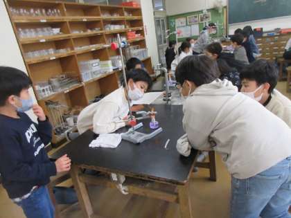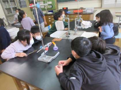 金属棒を熱するとどうなるのか、熱の伝わり方の実験です。子どもたちは変化を見逃さないように集中して見ています。