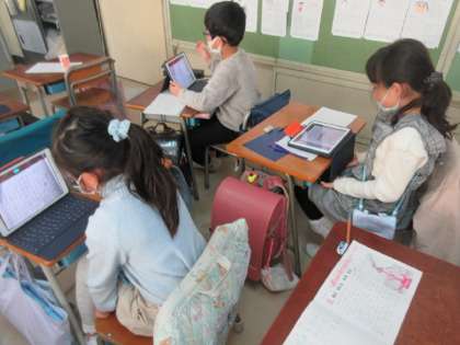 新規採用教員で1年担任の先生の授業を参観しました。子どもたちはタブレットを使いながら60−20の計算の仕方について自分なりによく考え、発表し合っていました。