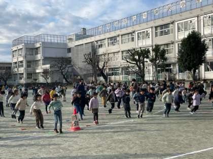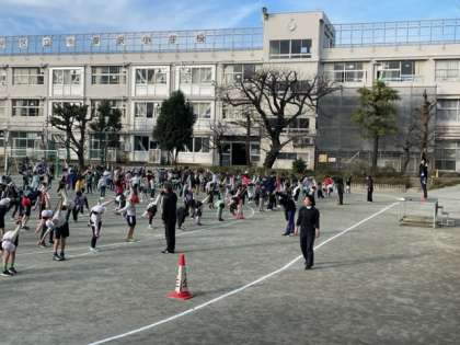 今朝は低学年の体育朝会です。まずは準備運動から。