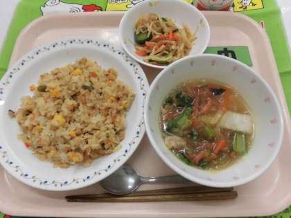 【献立】そぼろごはん・もやしのコチュジャンかけ・白菜と春雨のスープ・牛乳